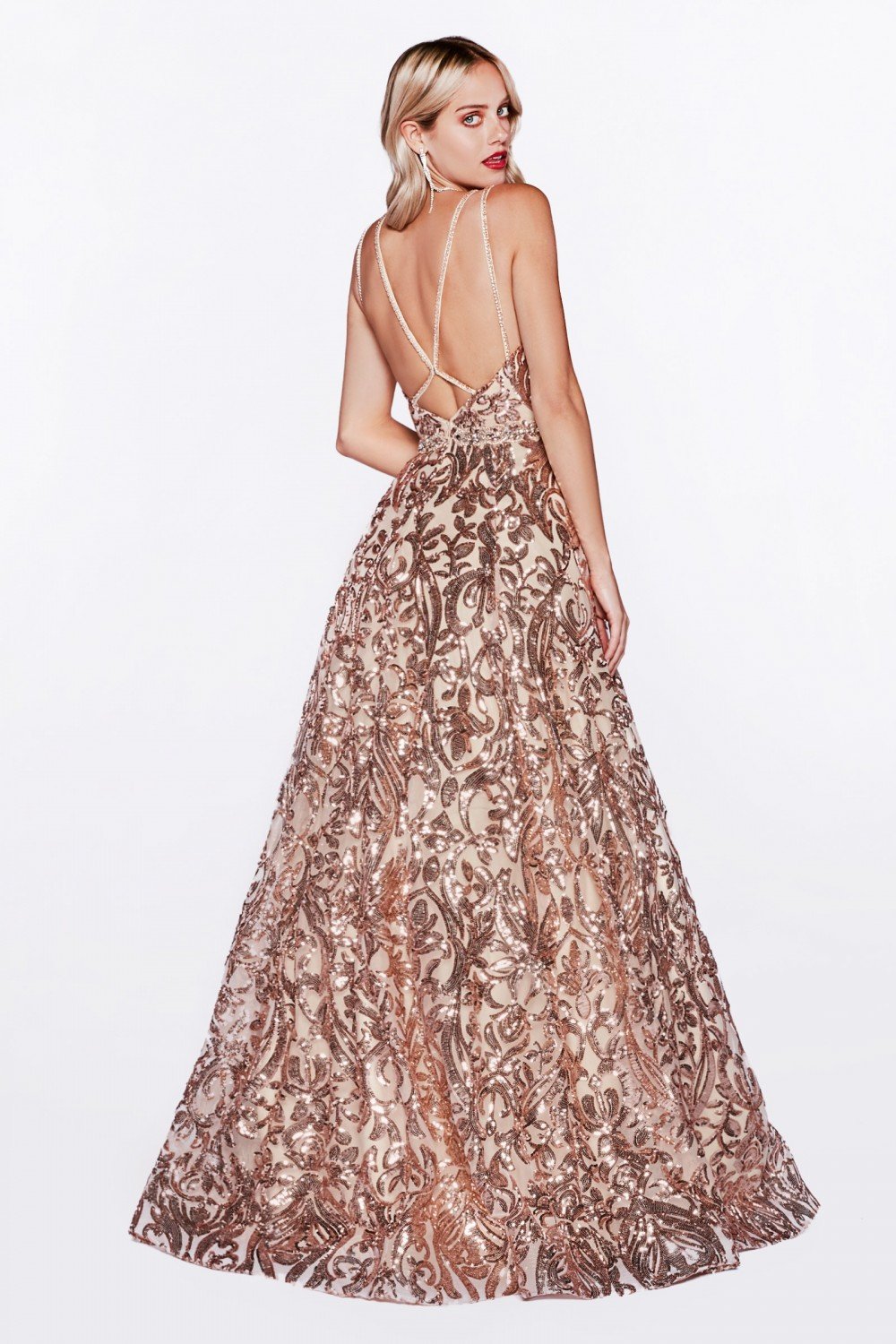 Long Formal Evening Dresses with v-neckline, sequined dress, open back with zippered closure, a-line shape.