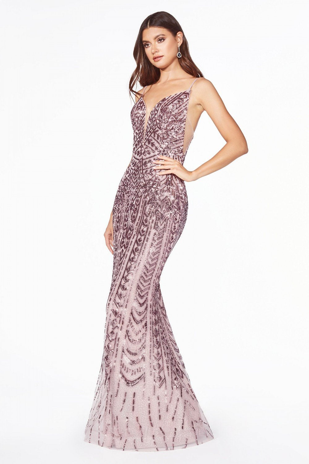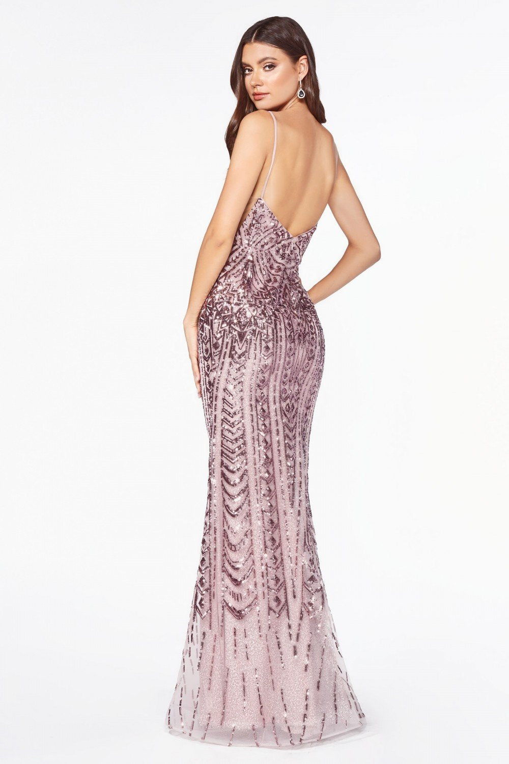 Long Formal Evening Dresses with v-neckline, sequined dress, open back with zippered closure, mermaid shape.