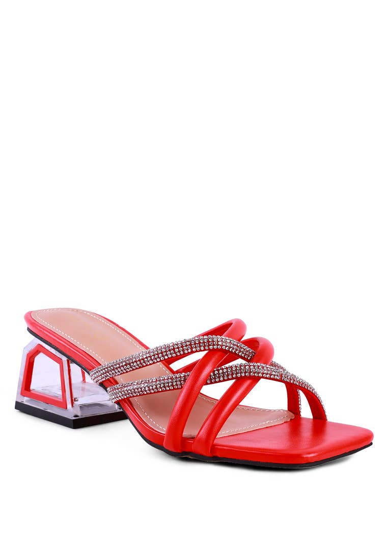 With intertwined straps, this pair of low-heeled sandals will support all your moves in the party - has studded diamante details along and beautiful cut detail clear heel with frame.