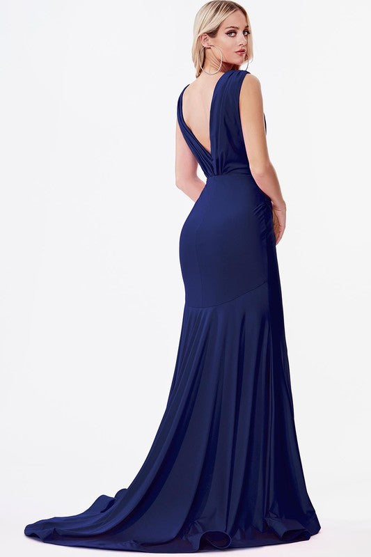 Fitted jersey gown with rouched waistline and pleated deep v-neckline.